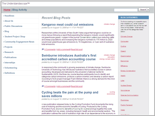 A custom "web site" style skin for Traction TeamPage was used for the Understandascope site which includes tabbed navigation on the left to the key parts of the community and their content. The interface helps mix the simple navigation of a website with the need to communicate regularly via a blog, support discussion, and perform wiki style activity like managing a list of definitions.